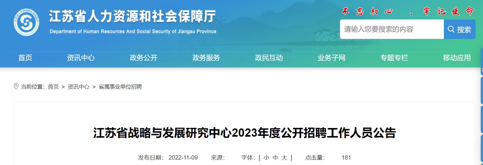 江蘇省戰(zhàn)略與發(fā)展研究中心于2019年經(jīng)中央編辦、省委編委批準(zhǔn)組建成立,為江蘇省發(fā)展和改革委員會(huì)主管的全額撥款公益一類(lèi)事業(yè)單位(副廳級(jí)),位于江蘇省南京市鼓樓區(qū)浦江路30號(hào),主要職責(zé)是圍繞省委、省政府決策部署和省發(fā)展改革委中心工作,綜合研判國(guó)民經(jīng)濟(jì)和社會(huì)發(fā)展運(yùn)行的基本態(tài)勢(shì),研究分析經(jīng)濟(jì)社會(huì)發(fā)展戰(zhàn)略和中長(zhǎng)期經(jīng)濟(jì)社會(huì)發(fā)展趨勢(shì),調(diào)查研究經(jīng)濟(jì)社會(huì)發(fā)展中的戰(zhàn)略性、前瞻性、全局性以及重點(diǎn)、熱點(diǎn)、難點(diǎn)問(wèn)題,為制定重大戰(zhàn)略、重大政策、重大規(guī)劃提供政策建議和決策咨詢意見(jiàn)。為更好地選拔優(yōu)秀適崗人才,充實(shí)人才隊(duì)伍,優(yōu)化隊(duì)伍結(jié)構(gòu),江蘇省戰(zhàn)略與發(fā)展研究中心現(xiàn)面向社會(huì)公開(kāi)招聘優(yōu)秀人才。根據(jù)《江蘇省事業(yè)單位公開(kāi)招聘人員辦法》(蘇辦發(fā)〔2020〕9號(hào))等規(guī)定,現(xiàn)將有關(guān)事項(xiàng)公告如下: