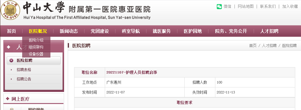 2022廣東惠州市中山大學(xué)附屬第一醫(yī)院惠亞醫(yī)院護(hù)理人員招聘100人,報(bào)名時(shí)間:2022年11月13日截止,現(xiàn)將招聘啟事原文發(fā)布如下: