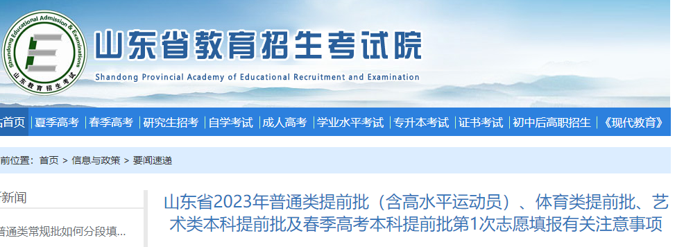 高考頻道從山東省教育招生考試院了解到,2023年山東高考體育類、藝術類及春季高考提前批志愿填報的通知已公布,具體如下: