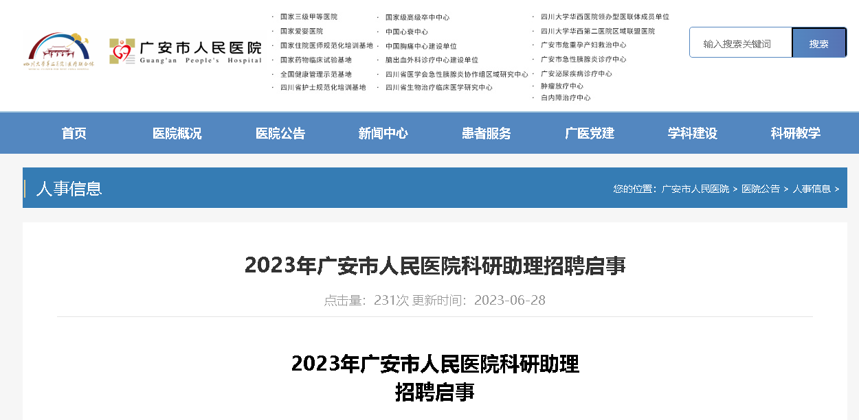 2023四川廣安市人民醫(yī)院科研助理招聘10人,報名時間:2023年6月28日—2023年7月7日18:00(逾期將不再接收報名),現(xiàn)將招聘公告原文發(fā)布如下: