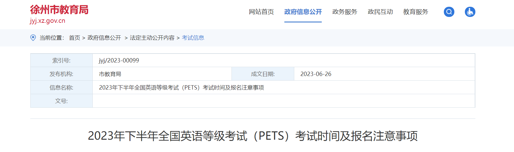 從徐州市教育局獲悉,2023下半年江蘇徐州全國英語等級考試(PETS)考試時間及報名注意事項已公布,請相關人員仔細閱讀,具體詳情如下: