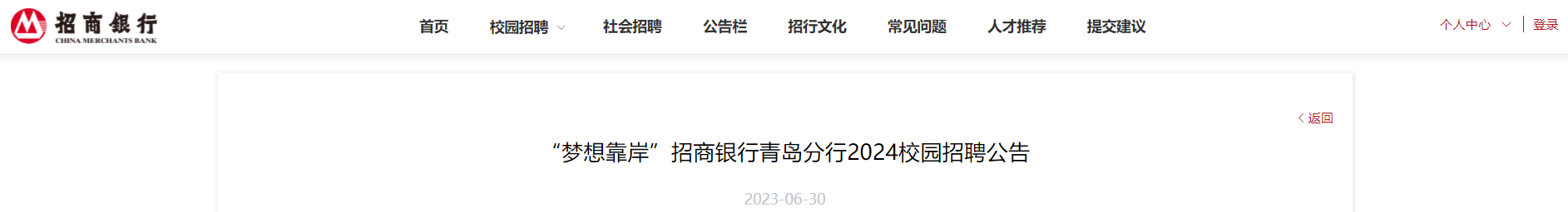 2024夢(mèng)想靠岸招商銀行山東青島分行校園招聘公告已發(fā)布,簡(jiǎn)歷投遞時(shí)間:2023年10月12日截止,現(xiàn)將招聘公告發(fā)布如下: