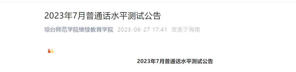 為更好地推廣普通話水平測試工作,滿足廣大考生求職就業(yè)需求,按照2023年普通話水平測試計劃,海南省普通話和文字應(yīng)用培訓(xùn)測試中心擬定于2023年7月8-9日在瓊臺師范學(xué)院府城校區(qū)舉辦一期普通話水平測試。現(xiàn)將報名、測試有關(guān)情況通知如下,請廣大考生務(wù)必認(rèn)真、完整閱讀。