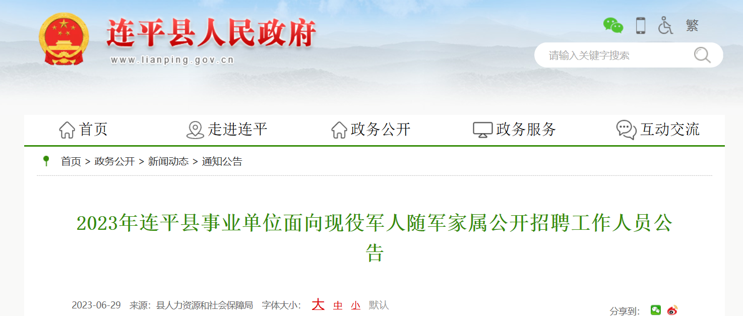 根據(jù)《廣東省事業(yè)單位公開招聘人員辦法》、《河源市軍人隨軍家屬就業(yè)安置實(shí)施辦法》(河府〔2021〕43號)文件精神及縣委、縣政府決定,為做好隨軍家屬安置工作,連平縣事業(yè)單位面向駐河源市連平縣部隊(duì)現(xiàn)役軍人隨軍家屬招聘工作人員,有關(guān)事項(xiàng)公告如下: