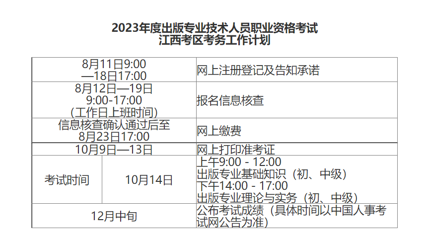 從江西人事考試網(wǎng)發(fā)布的《2023年江西出版專業(yè)技術(shù)人員職業(yè)資格考試考務(wù)工作的通知》得知,2023年江西出版專業(yè)資格考試時間、科目及考點已公布,10月14日舉行考試,10月9日-13日打印準(zhǔn)考證,具體詳情如下: