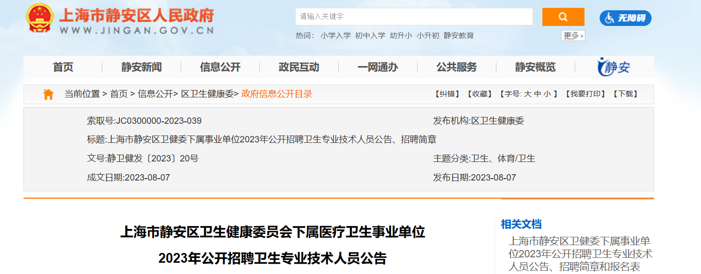 2023年上海市靜安區(qū)衛(wèi)生健康委員會下屬醫(yī)療衛(wèi)生事業(yè)單位招聘衛(wèi)生專業(yè)技術(shù)人員。報名時間:2023年8月23日至2023年8月24日, 上午9點30分至12點30分,下午1點30分至3點30分,現(xiàn)將公告原文發(fā)布如下: