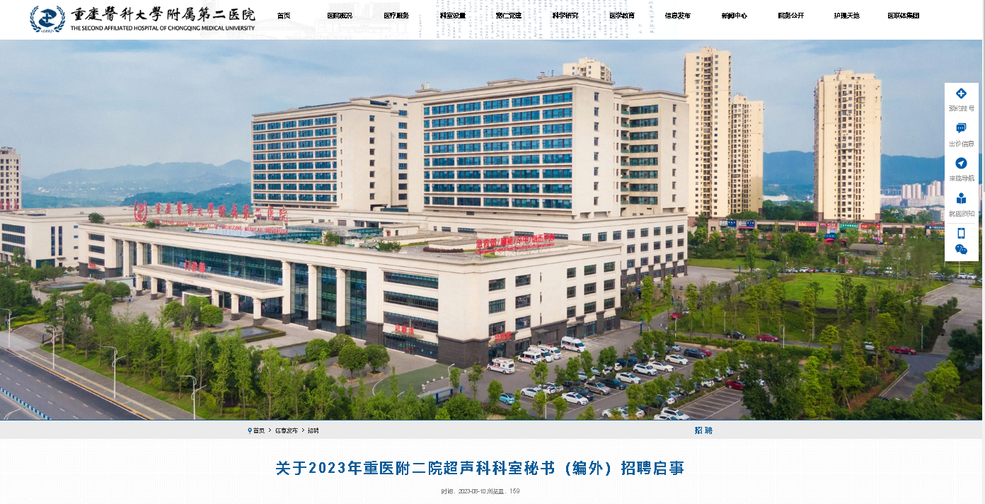 2023重慶醫(yī)科大學(xué)附屬第二醫(yī)院超聲科科室秘書(編外)招聘1人,報(bào)名時(shí)間:2023年8月16日14:00截止,現(xiàn)將招聘公告原文發(fā)布如下: