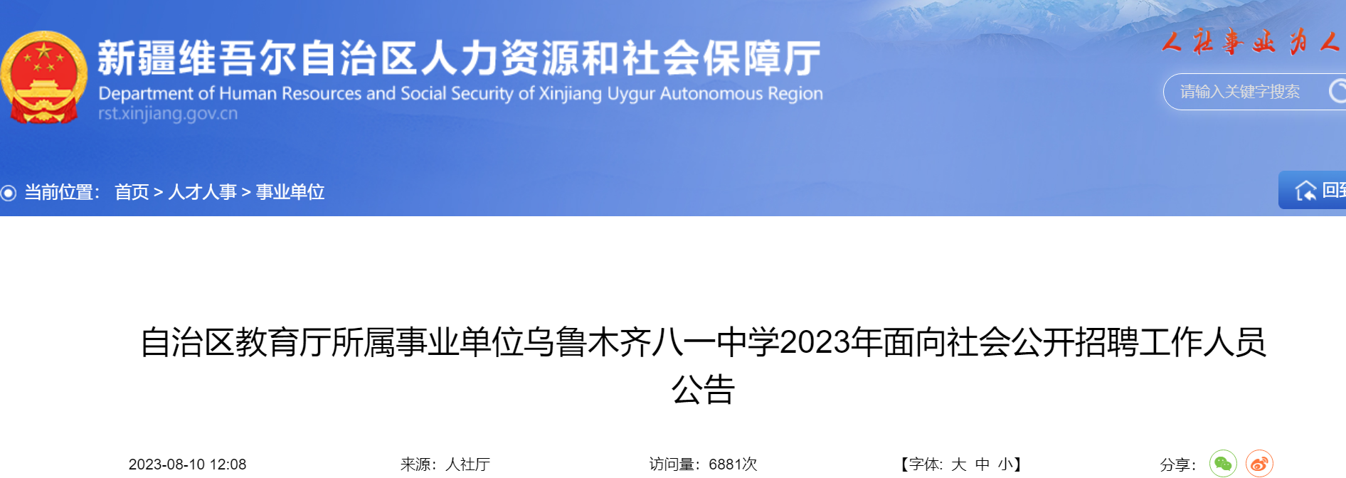 2023新疆烏魯木齊八一中學面向社會招聘工作人員12人,報名時間:2023年8月11日10:00至2023年8月21日19:00?,F(xiàn)將招聘公告原文發(fā)布如下: