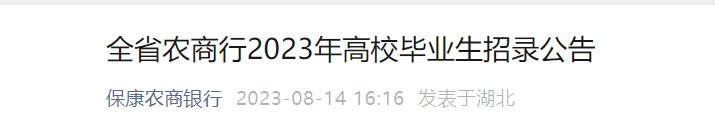 2023年湖北保康農(nóng)商銀行高校畢業(yè)生招錄15人,報(bào)名時(shí)間:2023年8月14日11:00至8月18日17:30,現(xiàn)將招聘公告發(fā)布如下: