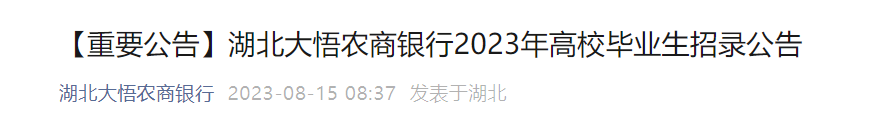 2023年湖北大悟農(nóng)商銀行高校畢業(yè)生招錄23人,報(bào)名時間:2023年8月14日11:00至8月18日17:30,現(xiàn)將招聘公告發(fā)布如下: