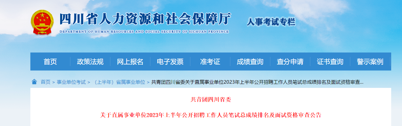 根據(jù)《共青團(tuán)四川省委關(guān)于直屬事業(yè)單位2023年上半年公開招聘工作人員工作計(jì)劃》的規(guī)定,此次考錄工作已進(jìn)入面試資格復(fù)審階段?,F(xiàn)將筆試總成績(jī)排名和面試資格審查有關(guān)事項(xiàng)公告如下: