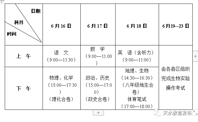 根據(jù)天水發(fā)布的《2023年甘肅天水市高中階段招生考試(中考)政策解讀》中得知,2023年甘肅天水中考時(shí)間定于6月16日—6月18日舉行,相關(guān)事宜如下: