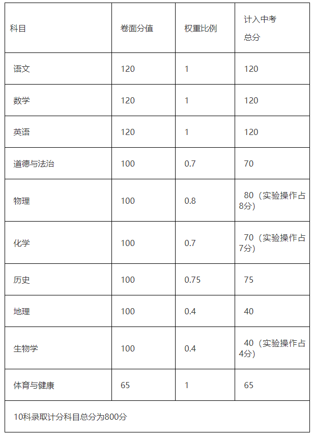 中考成績采用折算后分?jǐn)?shù)的形式公布。2023年我市中考總分為800分,各科的卷面分值和納入錄取總分的權(quán)重比例見下表。