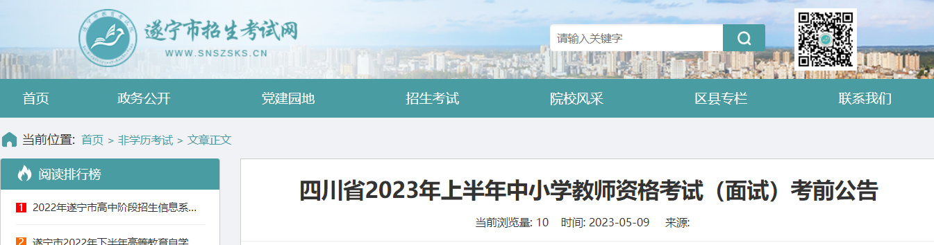 從遂寧市招生考試網(wǎng)獲悉,2023年上半年四川中小學(xué)教師資格考試(面試)考前公告已公布,請(qǐng)相關(guān)人員仔細(xì)閱讀,具體詳情如下: