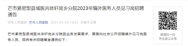 芒市緊密型縣域醫(yī)共體軒崗鄉(xiāng)分院因業(yè)務(wù)發(fā)展需求,需面向社會公開招聘編外見習(xí)崗醫(yī)務(wù)人員,現(xiàn)將有關(guān)招聘事宜通告如下: