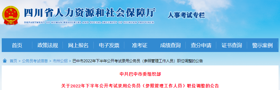 原文標題:中共巴中市委組織部關于2022年下半年公開考試錄用公務員(參照管理工作人員)職位調整的公告