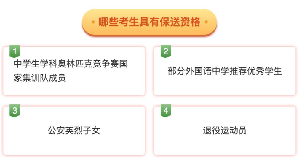根據(jù)2022年教育部等有關(guān)部門規(guī)定,中學(xué)生學(xué)科奧林匹克競(jìng)賽國(guó)家集訓(xùn)隊(duì)成員、部分外國(guó)語(yǔ)中學(xué)推薦優(yōu)秀學(xué)生、公安英烈子女、退役運(yùn)動(dòng)員等人員仍具備高校保送資格。