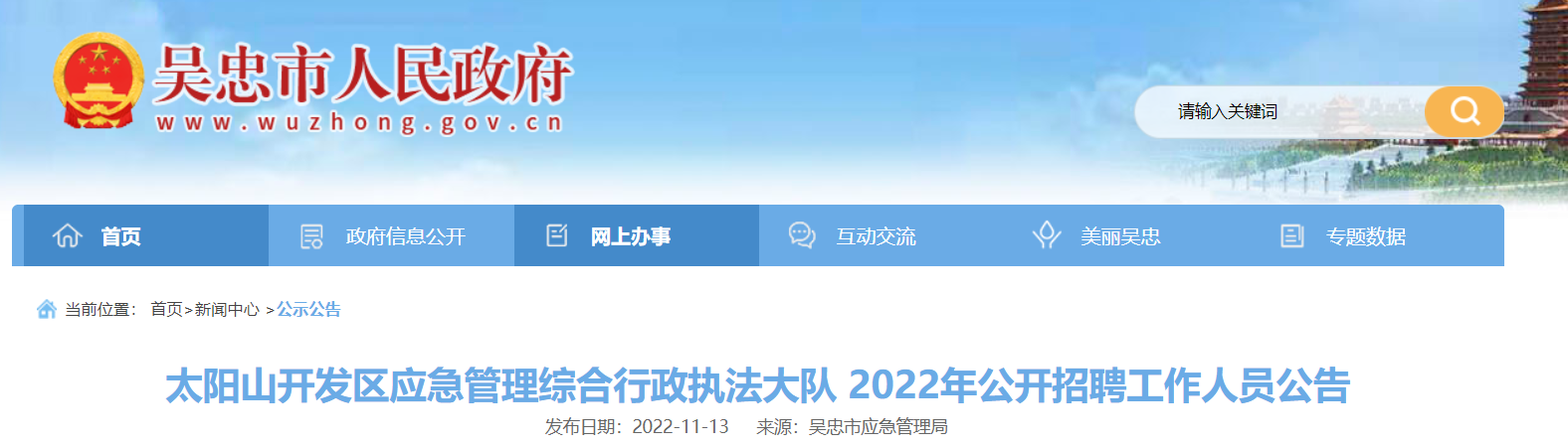 2022年寧夏吳忠市太陽山開發(fā)區(qū)應(yīng)急管理綜合行政執(zhí)法大隊招聘公告已發(fā)布。本次招聘實行網(wǎng)上報名、網(wǎng)上資格初核、網(wǎng)上打印準(zhǔn)考證。現(xiàn)將公告原文發(fā)布如下: