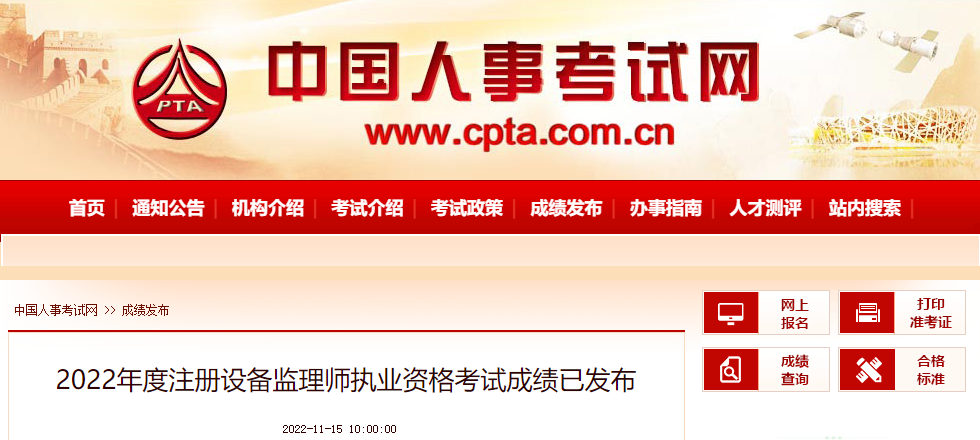 #】從中國人事考試網(wǎng)獲悉,2022年寧夏注冊設備監(jiān)理師成績于11月15日正式公布,考生通過點擊導航中“成績查詢”,輸入“用戶名”、“密碼”進行查分。詳情如下: