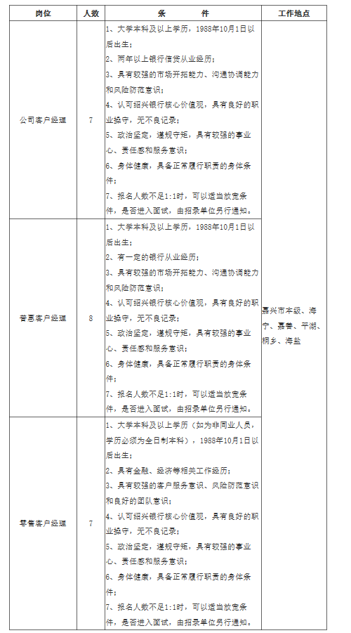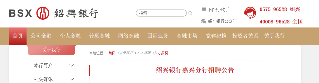 因紹興銀行嘉興分行業(yè)務(wù)發(fā)展需要,現(xiàn)面向嘉興全市范圍內(nèi)定向誠聘英才,我們熱忱歡迎各位英才加盟,攜手同行,共創(chuàng)輝煌!