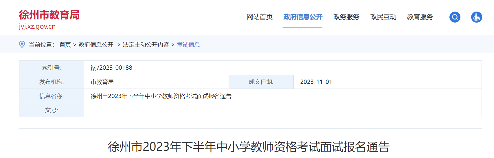 從徐州市教育局獲悉,2023下半年江蘇徐州中小學(xué)教師資格考試面試報(bào)名通告已公布,審核時(shí)間為11月10日-12日,具體詳情如下: