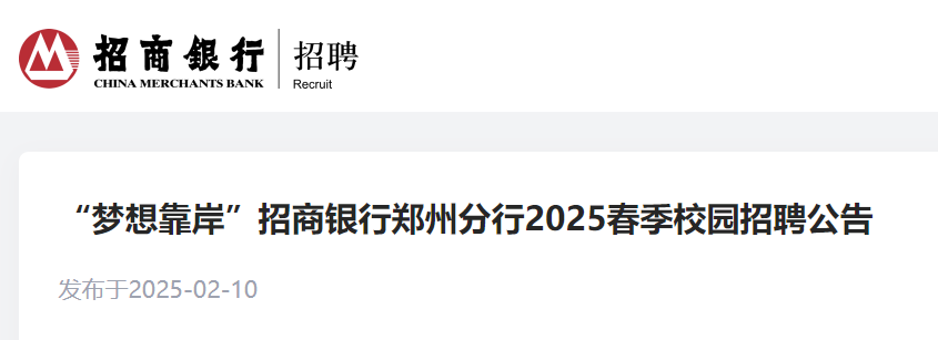 “夢想靠岸”招商銀行河南鄭州分行2025春季校園招聘公告已發(fā)布,簡歷投遞時間:截至2025年4月10日。現(xiàn)將招聘公告原文發(fā)布如下: