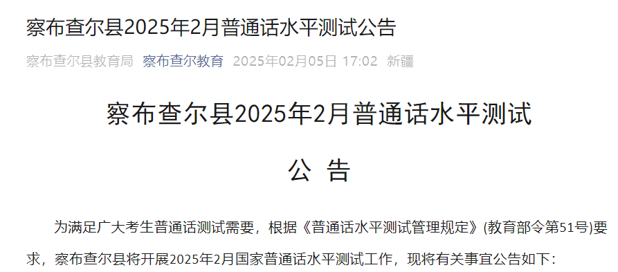 為滿足廣大考生普通話測試需要,根據《普通話水平測試管理規(guī)定》(教育部令第51號)要求,察布查爾縣將開展2025年2月國家普通話水平測試工作,現將有關事宜公告如下: