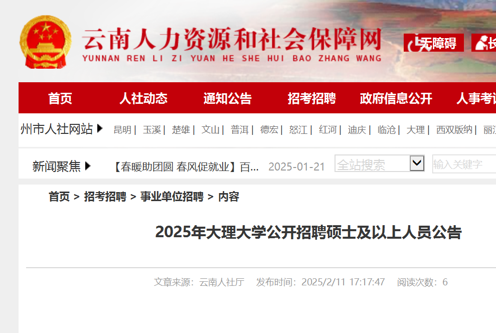 2025年大理大學(xué)公開(kāi)招聘統(tǒng)一在大理大學(xué)門(mén)戶網(wǎng)站進(jìn)行網(wǎng)絡(luò)報(bào)名。