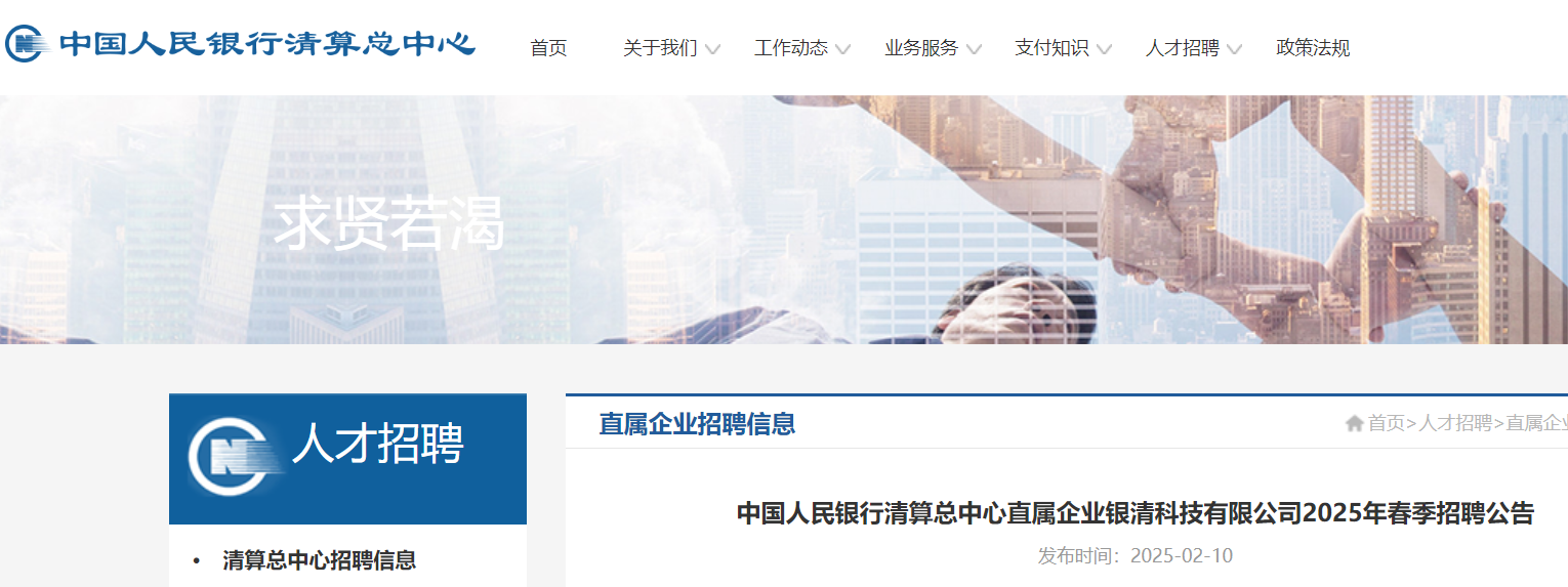 中國(guó)人民銀行清算總中心直屬企業(yè)銀清科技有限公司2025年春季招聘公告已發(fā)布,報(bào)名時(shí)間:2025年2月10日9點(diǎn)-2月19日17點(diǎn)?,F(xiàn)將招聘公告原文發(fā)布如下: