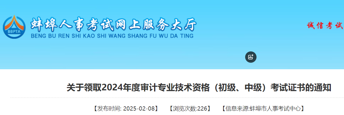 小編根據(jù)蚌埠人事考試網(wǎng)發(fā)布”關(guān)于領(lǐng)取2024年度審計專業(yè)技術(shù)資格(初級、中級)考試證書的通知“得知,安徽蚌埠2024年審計師證書領(lǐng)取證書將采取統(tǒng)一郵寄方式進行送達。