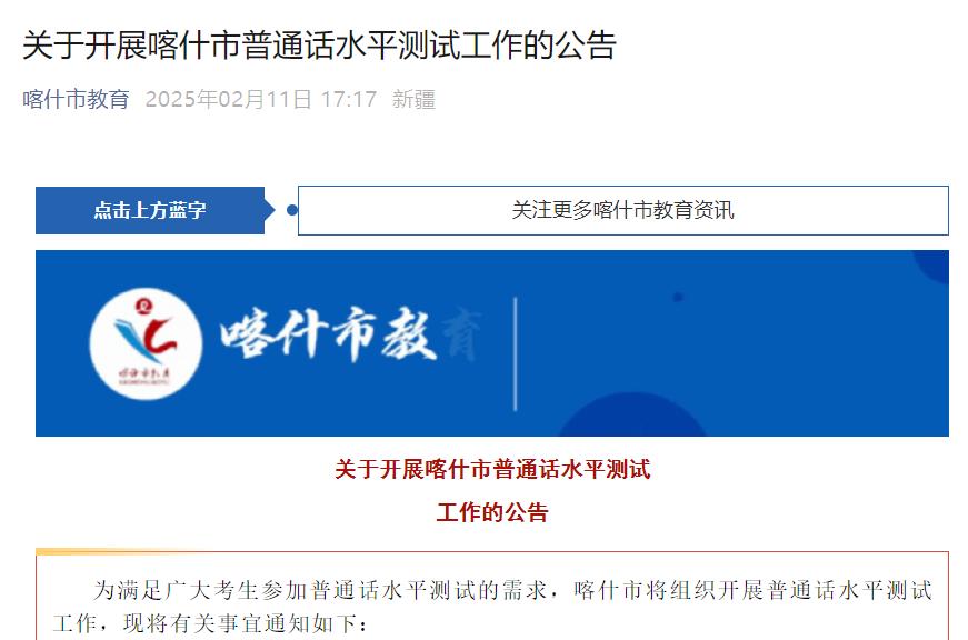 為滿足廣大考生參加普通話水平測試的需求,喀什市將組織開展普通話水平測試工作,現(xiàn)將有關(guān)事宜通知如下: