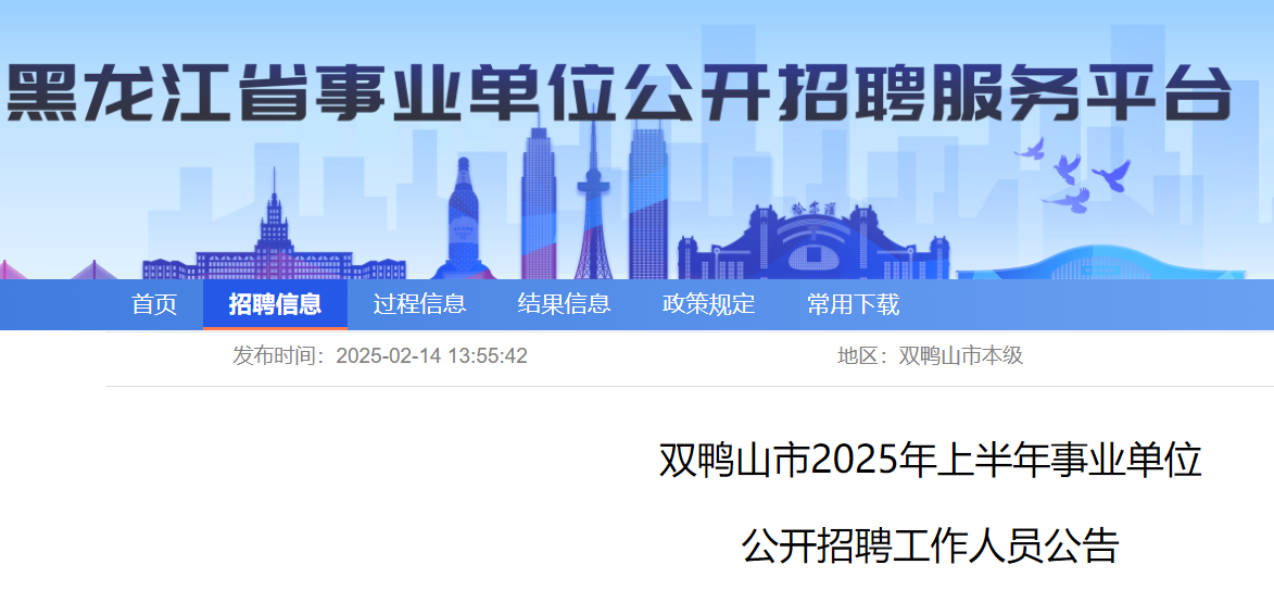 本次計(jì)劃招聘事業(yè)單位工作人員共397名。具體招聘單位、崗位、人數(shù)、條件等詳見《雙鴨山市2025年上半年事業(yè)單位公開招聘工作人員崗位計(jì)劃表》(附件1)。