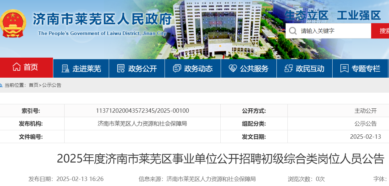 根據(jù)事業(yè)單位公開招聘有關(guān)規(guī)定,結(jié)合濟南市萊蕪區(qū)事業(yè)單位崗位空缺情況和工作需要,現(xiàn)將2025年度濟南市萊蕪區(qū)事業(yè)單位公開招聘初級綜合類崗位人員有關(guān)事項公告如下: