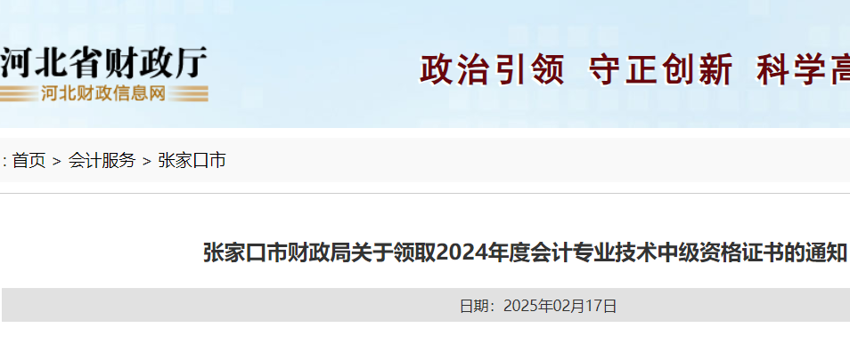 小編根據張家口市財政局發(fā)布“張家口市財政局關于領取2024年度會計專業(yè)技術中級資格證書的通知”得知,河北張家口2024年中級會計證書領取時間2025年2月18日起陸續(xù)辦理。
