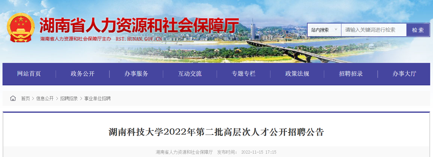 招聘信息通過湖南省人力資源和社會保障廳(http://rst.hunan.gov.cn/)、湖南科技大學人事處網站面向社會公開發(fā)布。