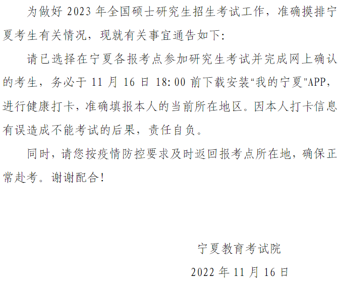 點(diǎn)擊查看:關(guān)于摸排寧夏2023年全國(guó)碩士研究生招生考試考生信息的通告