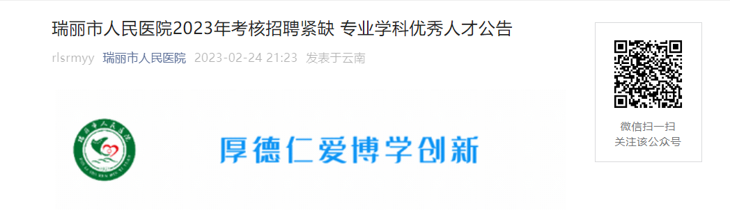 原文標(biāo)題:瑞麗市人民醫(yī)院2023年考核招聘緊缺專業(yè)學(xué)科優(yōu)秀人才公告