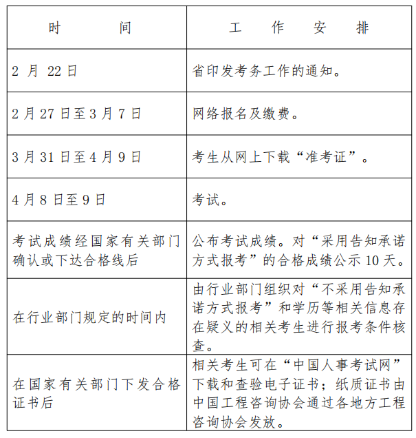 3.報考條件中所稱“從業(yè)年限”,是指報考人員自參加工作之日起累計從事工程咨詢業(yè)務時間的總和,全日制教育取得畢業(yè)證書前“實習期”和脫產(chǎn)學習的時間均不計入專業(yè)年限,計算截止日期為考試當年度的12月31日。