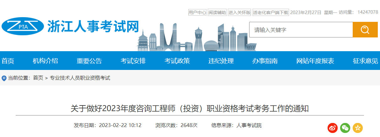 從浙江人事考試網(wǎng)獲悉,《2023年浙江咨詢工程師(投資)職業(yè)資格考試報名通知》現(xiàn)已公布,報名時間:2月27日-3月7日,考試時間:4月8日-9日,更多事宜請參考閱讀《考務通知》,官方公告原文如下: