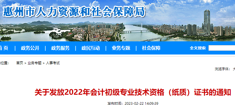 小編根據(jù)惠州市人力資源和社會(huì)保障局發(fā)布“關(guān)于發(fā)放2022年會(huì)計(jì)初級(jí)專業(yè)技術(shù)資格(紙質(zhì))證書的通知”得知,2022年廣東惠州初級(jí)會(huì)計(jì)職稱證書領(lǐng)取時(shí)間為2023年2月22日開始發(fā)放,詳情如下: