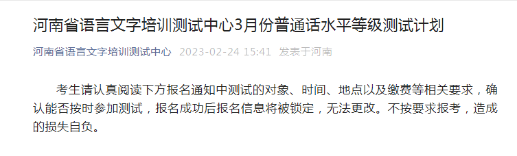 從河南省語言文字培訓(xùn)測試中心獲悉,2023年3月普通話考試時間及報名時間安排已公布,3月1日起報名,具體詳情如下: