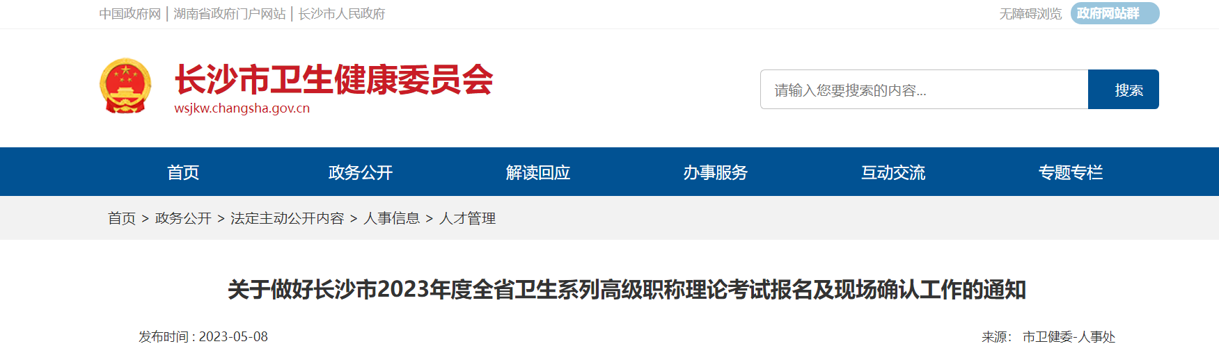 根據(jù)《湖南省衛(wèi)生健康委員會(huì)湖南省人力資源和社會(huì)保障廳關(guān)于做好2023年度全省衛(wèi)生系列高級(jí)職稱專業(yè)理論考試工作的通知》要求,現(xiàn)將長(zhǎng)沙市2023年度全省衛(wèi)生系列高級(jí)職稱理論考試報(bào)名及現(xiàn)場(chǎng)確認(rèn)工作有關(guān)安排通知如下:
