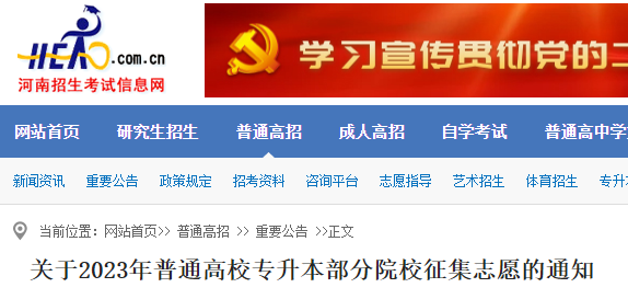 專升本考試頻道從河南招生考試信息網(wǎng)了解到,2023年河南普通高校專升本部分院校征集志愿的通知已公布,具體如下: