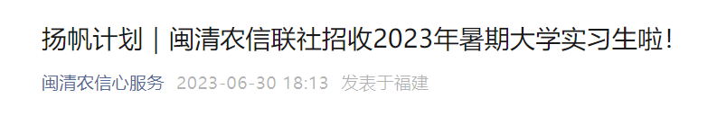 2023年福建閩清農(nóng)信聯(lián)社暑期大學(xué)實(shí)習(xí)生招收公告已發(fā)布,報(bào)名時(shí)間:2023年7月8日截止,現(xiàn)將招聘公告發(fā)布如下: