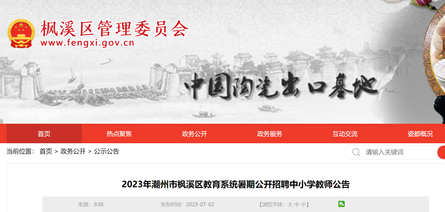 2023廣東潮州楓溪區(qū)教育系統(tǒng)暑期公開(kāi)招聘中小學(xué)教師30人,報(bào)名時(shí)間:2023年7月6日9:00至7月12日16:00?,F(xiàn)將招聘公告原文發(fā)布如下: