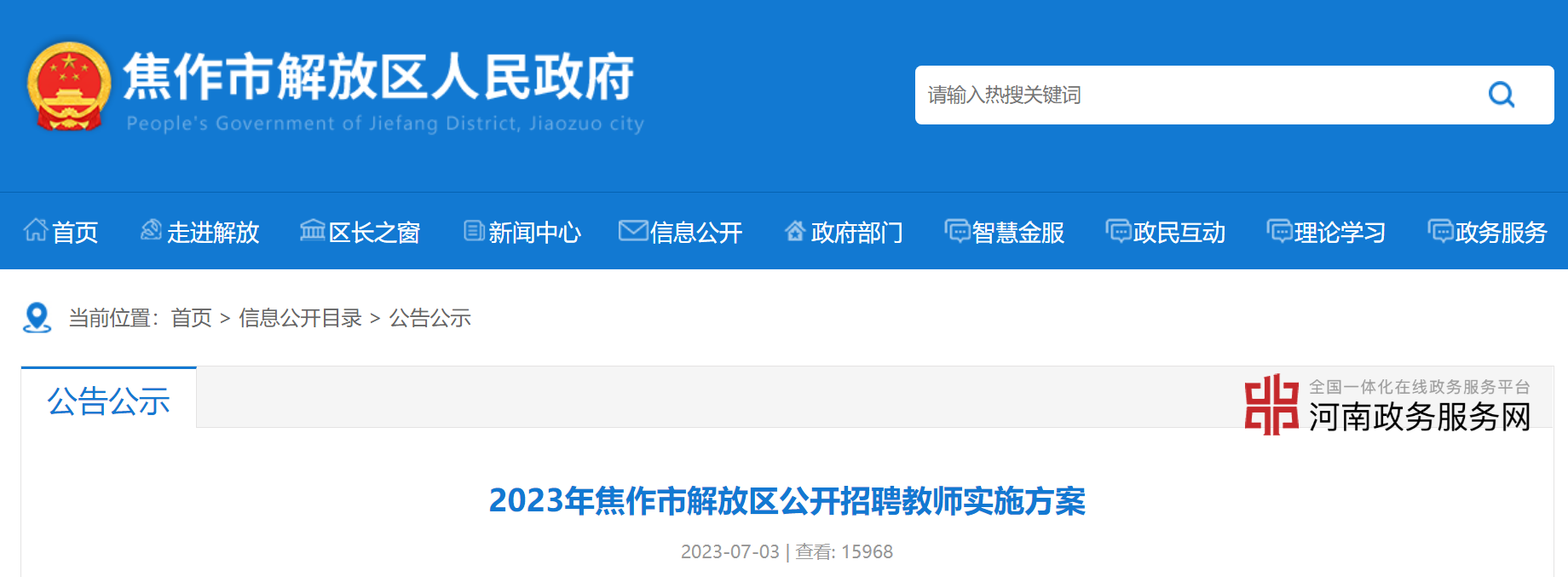 報(bào)考者請(qǐng)于2023年7月14日上午8:00至7月16日下午17:00期間登錄焦作市解放區(qū)人民政府(https://www.jfq.gov.cn/),點(diǎn)擊“2023年焦作市解放區(qū)公開招聘教師”進(jìn)入網(wǎng)上報(bào)名系統(tǒng),按照要求填寫并保存報(bào)名申請(qǐng)。