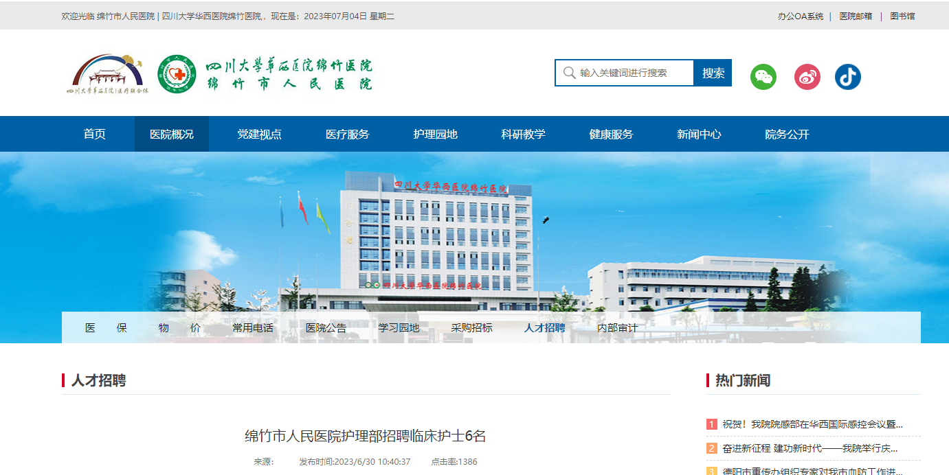 2023四川德陽市綿竹市人民醫(yī)院招聘臨床護士6人,報名截止時間為2023年7月14日18:00,現(xiàn)將招聘公告原文發(fā)布如下: