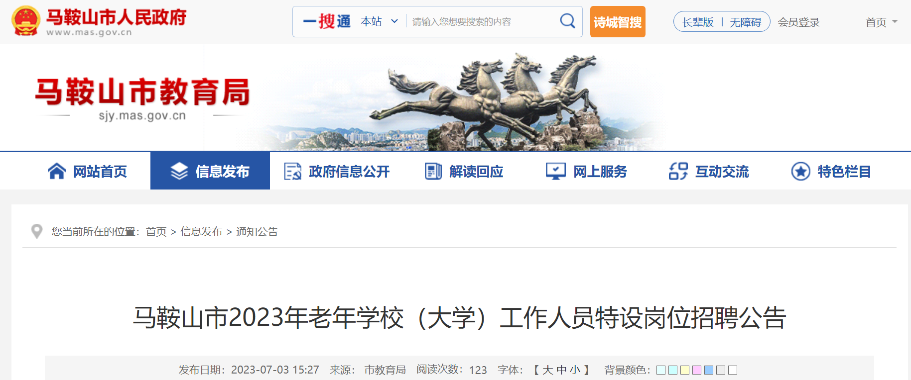 2023安徽馬鞍山市老年學(xué)校(大學(xué))工作人員特設(shè)崗位招聘34人,報(bào)名時(shí)間:7月10日至7月31日,現(xiàn)將招聘公告原文發(fā)布如下: