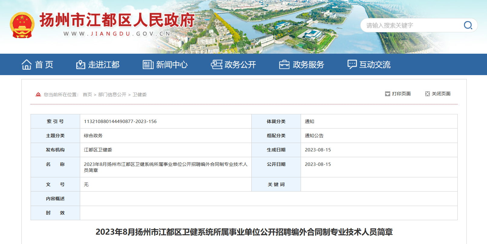 可直接登錄揚(yáng)州市江都區(qū)衛(wèi)生健康委員會網(wǎng)站(打開江都區(qū)人民政府網(wǎng)站-政務(wù)公開欄-部門信息公開欄-江都區(qū)衛(wèi)健委-法定主動公開內(nèi)容欄-通知公告欄),查詢《2023年8月?lián)P州市江都區(qū)衛(wèi)健系統(tǒng)所屬事業(yè)單位公開招聘編外合同制專業(yè)技術(shù)人員崗位條件簡介表》。
