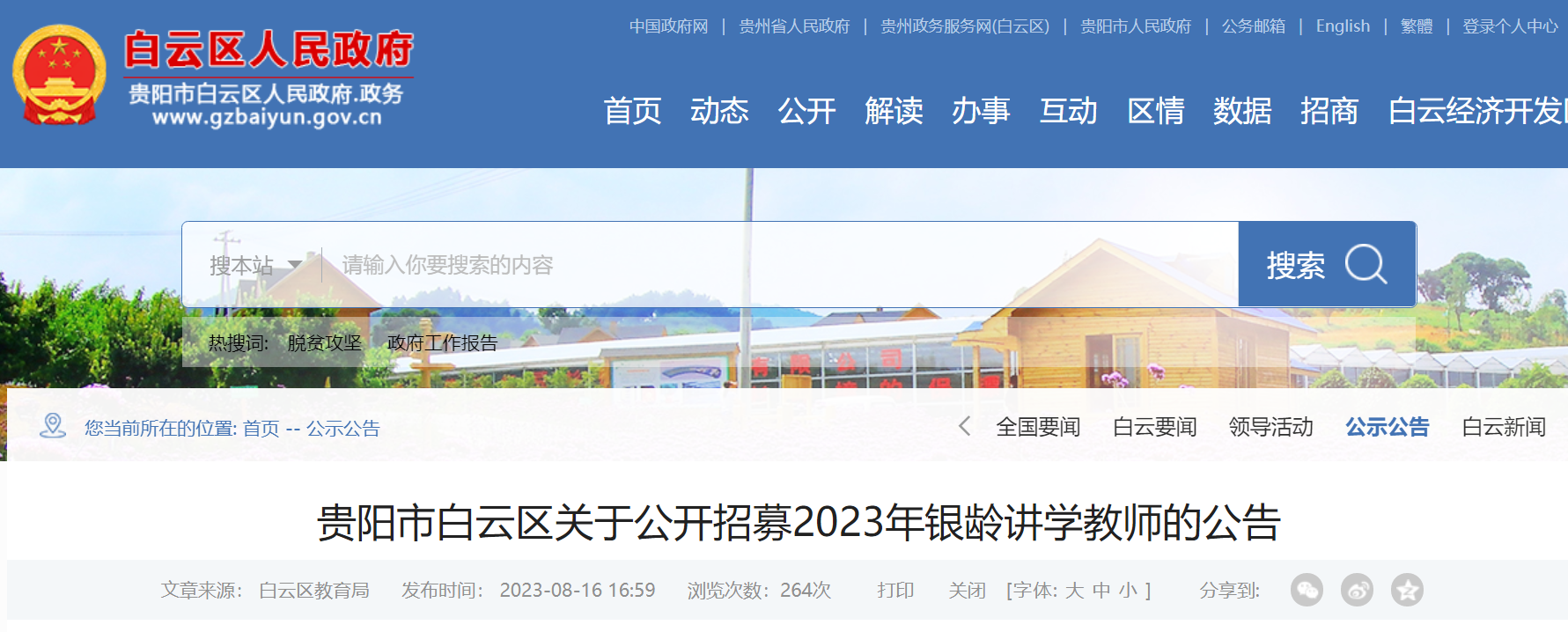 2023貴州貴陽白云區(qū)招募銀齡講學(xué)教師2人,講學(xué)教師服務(wù)時間原則上為1學(xué)年。現(xiàn)將公告原文發(fā)布如下: